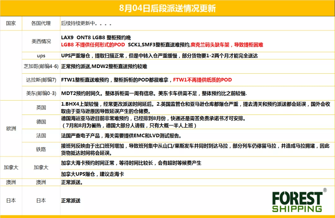 以上这些是导致后端派送几近瘫痪的原因,但也不是所有国家所有区域都是这样的,为此我们整理了8月4日各个国家后程派送的真实情况供大家参考。